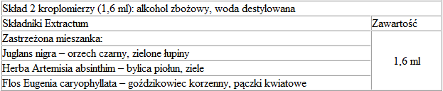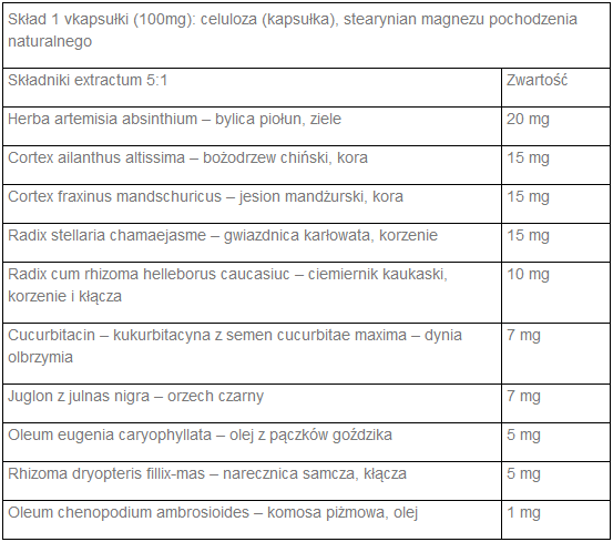 Antykontamin Forte™ - ulepszona formuła zawiera mocniejsze ekstrakty roślinne. Preparat wzbogacono w kukurbitacynę - substancję przeciwpasożytniczą wyodrębnioną z pestek dyni, juglon - z łupin orzecha czarnego oraz olejek komosowy (zawiera askaridol i p-cymen) silny środek wobec obleńców: owsiki, glista ludzka oraz tęgoryjca dwunastnicy, tasiemca uzbrojonego i nieuzbrojonego. Poraża on mięśnie robaków, umożliwiając ich wydalenie z kałem. Olejek E. carophyllata i ekstrakty A. absinthim, F. mandschuricum wykazują silne właściwości przeciwbakteryjne i przeciwgrzybiczne wobec Candida albicans, Peptococcus, Peptostreptococcus, Escherichia colli, Staphylococcus i Streptococcus. Ekstrakt z D. filix-mas zawiera mono, di i trimeryczne floroglucyny - aspidinol i filicynę, powodujące paraliż mięśni tasiemca oraz są aktywne wobec motylicy wątrobowej. Sproszkowane korzenie S. chamaejasme wykazują silne właściwości fungistatyczne (hamujące wzrost grzybów) i antybiotyczne, wobec drożdżaków, grzybów polimorficznych oraz Helicobacter pylorii, Entamoeba histoiytica, Giardia intestinali, Peptostreptococcus. Saponiny triterpenowe z A. altissima wykazują działanie przeciwzapalnie, przeciwbakteryjne, pierwotniakobójcze, przeciwgrzybiczne i przeciwwirusowe oraz wykazują wysoką aktywność przeciwko tasiemcom. ![]() WŁAŚCIWOŚCI FARMAKOLOGICZNE: przeciwzapalne, bakterio-, grzybobójcze, rozkurczowe, ściągające, moczo- i żółciopędne. Preparat pobudza wydzielanie żołci, a zawarte w nim flawonoidy rozkurczają mięśnie gładkie dróg żółciowych, co ułatwia pozbycie się pasożytów z układu żółciowego. Gorycze zwiększają wydzielanie soku żołądkowego i trzustkowego, polepszając proces trawienia i wypróżniania. Garbniki katechinowe działają przeciwzapalnie i ściągająco na błonę śluzową przewodu pokarmowego, uszczelniają ściany włośniczek, tym samym likwidują szkody wyrządzone przez patologiczną florę. Askarydol, juglon, kukurbitacyna porażają układ nerwowy tasiemców, glist i owsików, dzięki czemu są usuwane z organizmu człowieka. Preparat przywraca właściwą homeostazę (równowagę kwasowo-zasadową), stwarza niekorzystne warunki dla patologicznej flory i pasożytów oraz oczyszcza organizm. WSKAZANIA DO STOSOWANIA: przerost patologicznej flory: Candida albicans, Gram dodatnich bakterii: Clostridium fifficile, Peptococcus, Peptostreptococcus, gronkowca: Staphylococcus aureus, S. epidermalis, paciorkowca: Streptococcus agalactiae, S. dysgalactiae, S. pyogenes, S. uberis, Enterococcus faecalis, Gram ujemnych bakterii: Bacteroides, Escherichia coli, Fusobacterium, Heliobacter pylori, Klebsiella, Proteus, Pseudomonas aeruginosa – pałeczka ropy błękitnej, Salmonella typhimurium, Shigella; pasożyty przewodu pokamowego: Enterobius vermicularis – owsiki, Ascaris lumbricoides – glista ludzka, Taenia saginata, solium – tasiemiec uzbrojony i nieuzbrojony, Giardia intestinalis, Giardia duodenalis – giardioza, Fasciola hepatica – motylica wątrobowa, Ancylostoma duodenale – tęgoryjec dwunastnicy, Trichinella spiralis – włosień kręty i inne patologiczne organizmy; biegunka lub zaparcia na tle bakteryjnym lub pasożytniczym, colon irritabile – zespół jelita nadwrażliwego, owrzodzenie jelita grubego i odbytnicy, niewydolność trzustki, wątroby, zastoiny żółci. UWAGA: stosując równolegle absorbent - Enterosżel, przyspieszymy proces detoksykacji. Preparat pochłonie w świetle przewodu pokarmowego toksyny i obumarłe mikroorganizmy oraz usunie je z organizmu. W przypadku: rozwolnienia, skoków ciśnienia, bólu brzucha dawkę preparatu należy odpowiednio zmniejszyć, aby uciążliwe reakcje ustąpiły. Mniejszą dawkę stosujemy przez I-2 tygodnie, a następnie kontynuujemy według przepisu. PRZECIWWSKAZANIA: świeży zawał serca, zaburzenia rytmu z bradykardią, kardiomiopatia przerostowa, częstoskurcz komorowy, ciąża, okres laktacji. indywidualna nietolerancja na komponenty preparatu, dzieci do 12 roku życia. DAWKOWANIE: preparat zawsze stosujemy l raz dziennie bezpośrednio przed snem. Stosujemy 1 kapsułkę codziennie przez 7 dni, następnie dawkę zwiększamy o 1 kapsułkę, aż do 6 kapsułek dziennie. Kontynuując leczenie, otrzymujemy dawkę na maksymalnym poziomie. Kuracja trwa 6 tygodni, w razie potrzeby może być dłuższa, maksymalnie 3 miesiące. PRZECHOWYWANIE: przechowywać w ciemnym, suchym miejscu, niedostępnym dla dzieci, w temperaturze pokojowej w szczelnie zamkniętym słoiku. Najlepiej zastosować przed terminem podanym na opakowaniu. OPAKOWANIE: 150 kapsułek po 120 mg w plastikowym pudełku. PRODUCENT: Parafarmacea®, ul. Lermontowa 2 A, m. Źeleznowodsk, 357400, Stawropolskij Kraj, Rosja. | ||